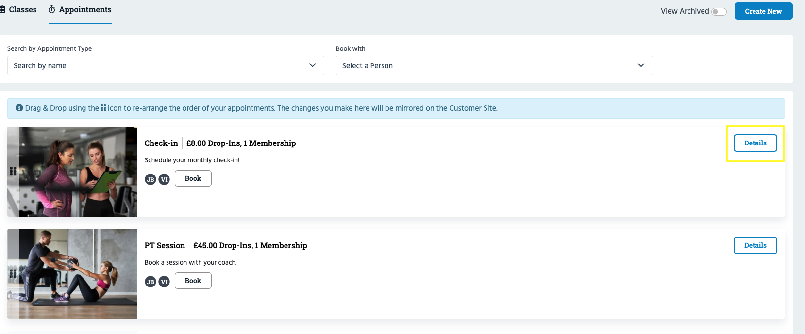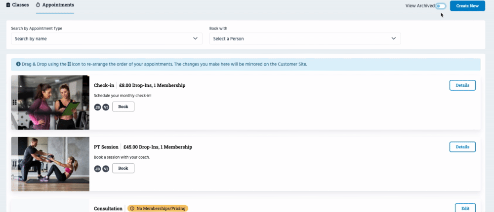If you need to unarchive an Appointment Type, head to Classes/Appointments >> Appointment Types >> click 'View Archived' >> click 'Details' next to the Appointment Type >> follow the same steps as above, but select 'Status - Active' instead. Once done, the Appointment Type will show as active.