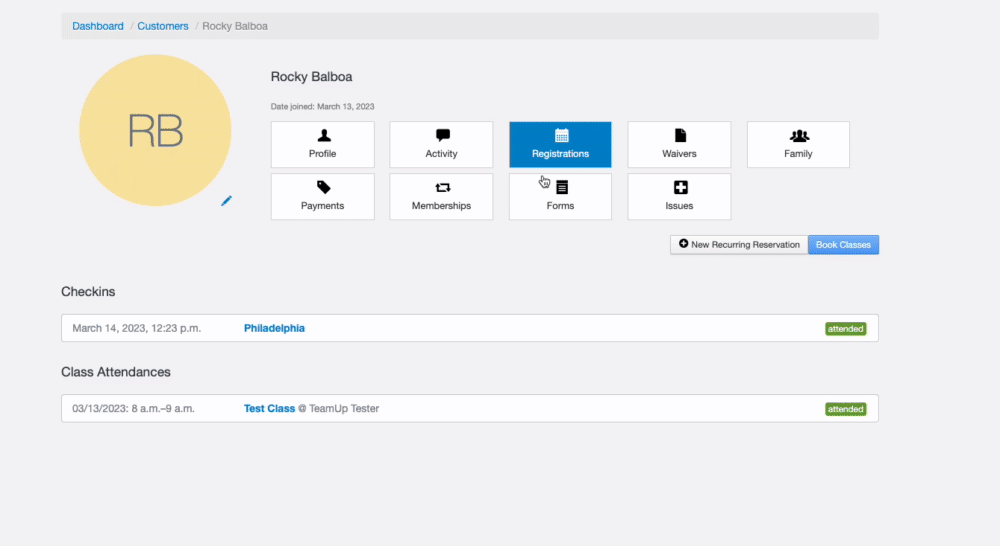 From the 'Registrations' tab on the customer profile (note that alternatively, you could also head to the 'Activity' tab on their profile):