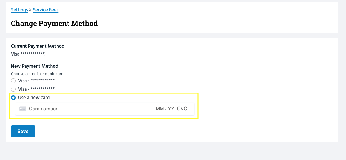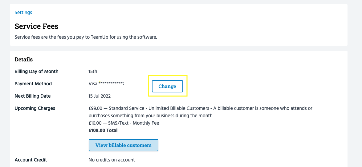 To change the payment details on your TeamUp account, head to Settings >> Service Fees >> click 'Change'.