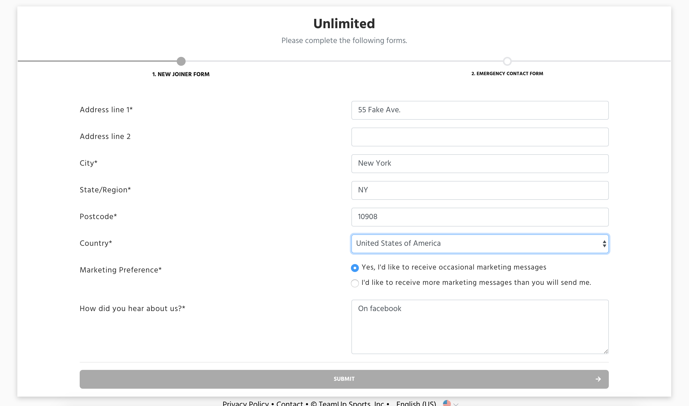Form fields collected then save to the customer profile, and throughout TeamUp for you to review.