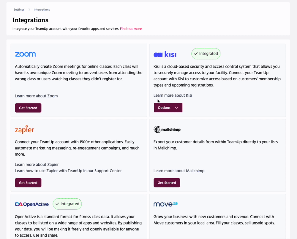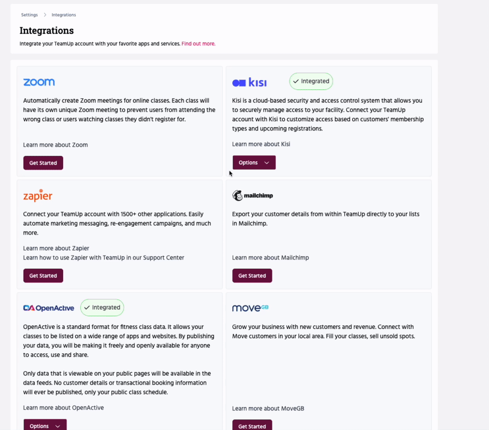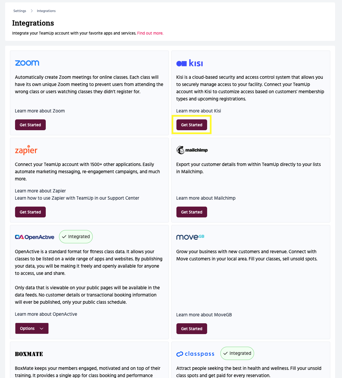 You'll now see that Kisi shows as 'Integrated' on your TeamUp integrations page.