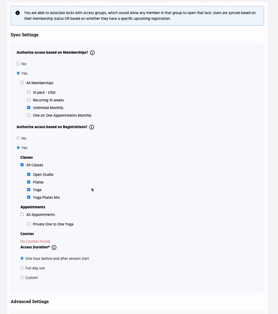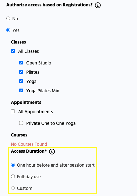 - Authorize access based on Registrations. Customers with any of the selected upcoming session registrations will be synced to this Access Group. Registration-based rules support all types of registrations: classes (including one-use plus), appointments and courses.