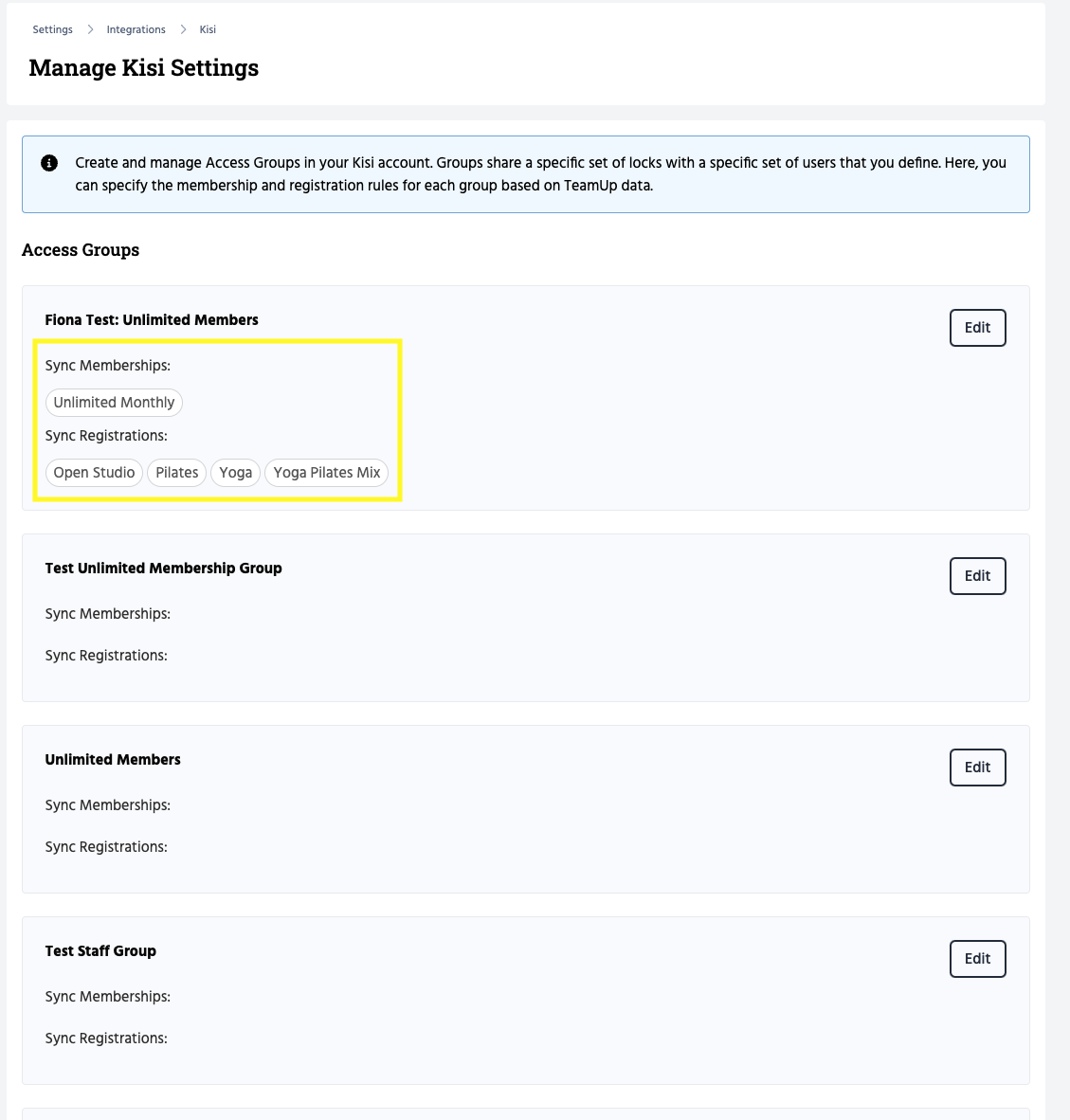If you've already got your groups created, these will be all listed up in your TeamUp account under 'Manage' in the Kisi 'Options' menu (as seen below). From this page, you can configure rules for each Group by clicking the 'Edit' button.