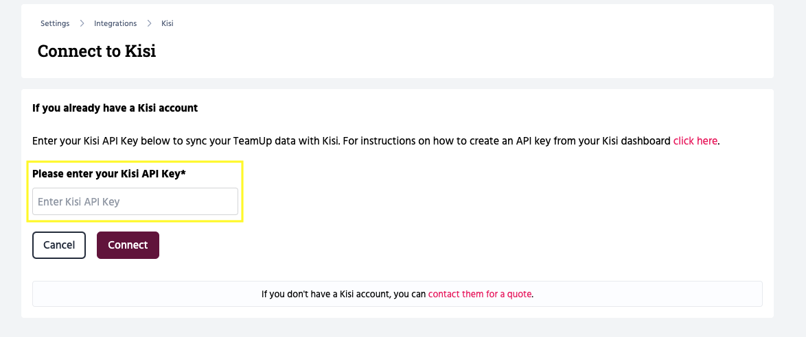 Important. Please note that in order to integrate TeamUp with Kisi, you'll need to create a Kisi account first. Click here to contact Kisi for more information.