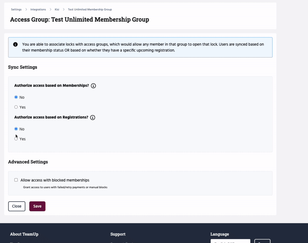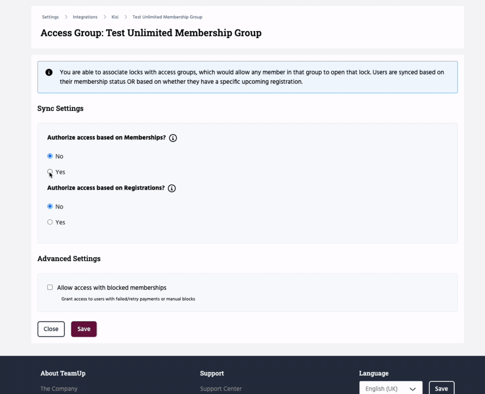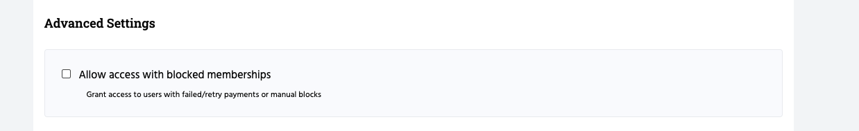 Additionally, you can opt to restrict or grant access for blocked memberships (if there is a failed or retry payment or a manual block), by selecting the 'Allow access with blocked memberships' option under 'Advanced Settings'.
