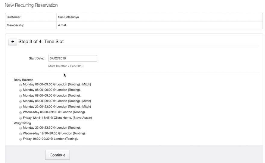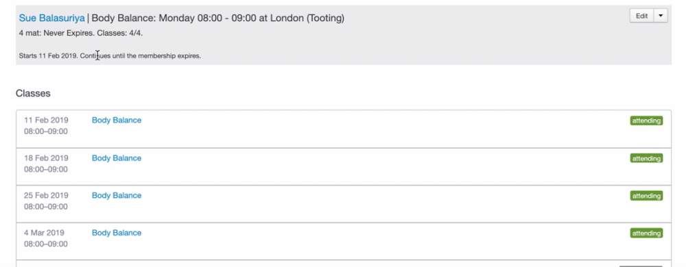 In the below example, it will start on 11th February 2019 for Body Balance Class at 08:00-09:00.