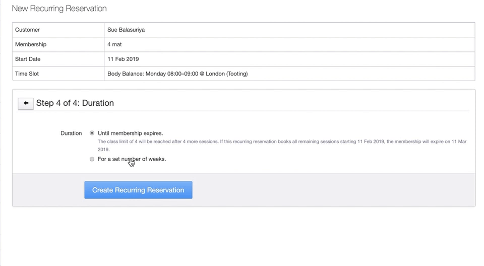 Finally, set the duration of the recurring reservation. You can keep the reservation running until the membership expires or for a set number of weeks.