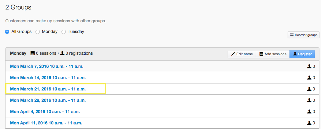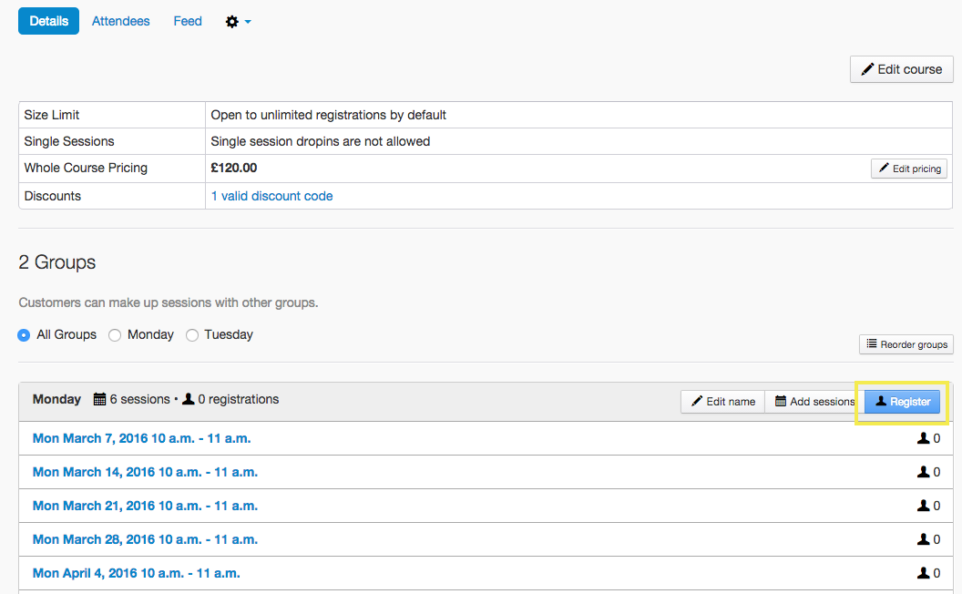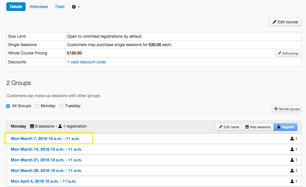 Note: if the customer has registered onto a course that has 6 sessions (for example), it will only be possible for them to attend 6 sessions in total across all available groups.