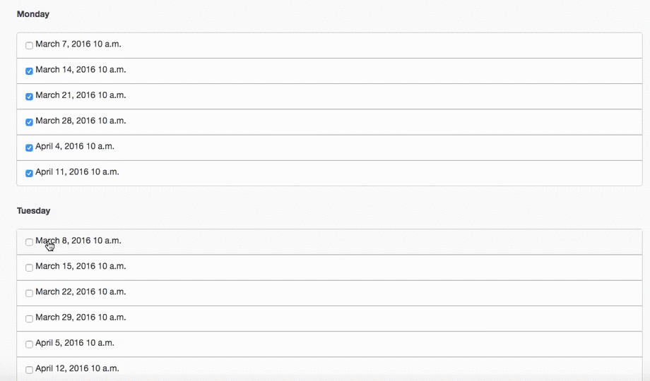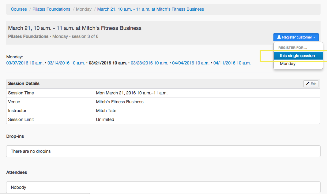 If your course allows drop-ins, just click on the desired session to add a customer to it.