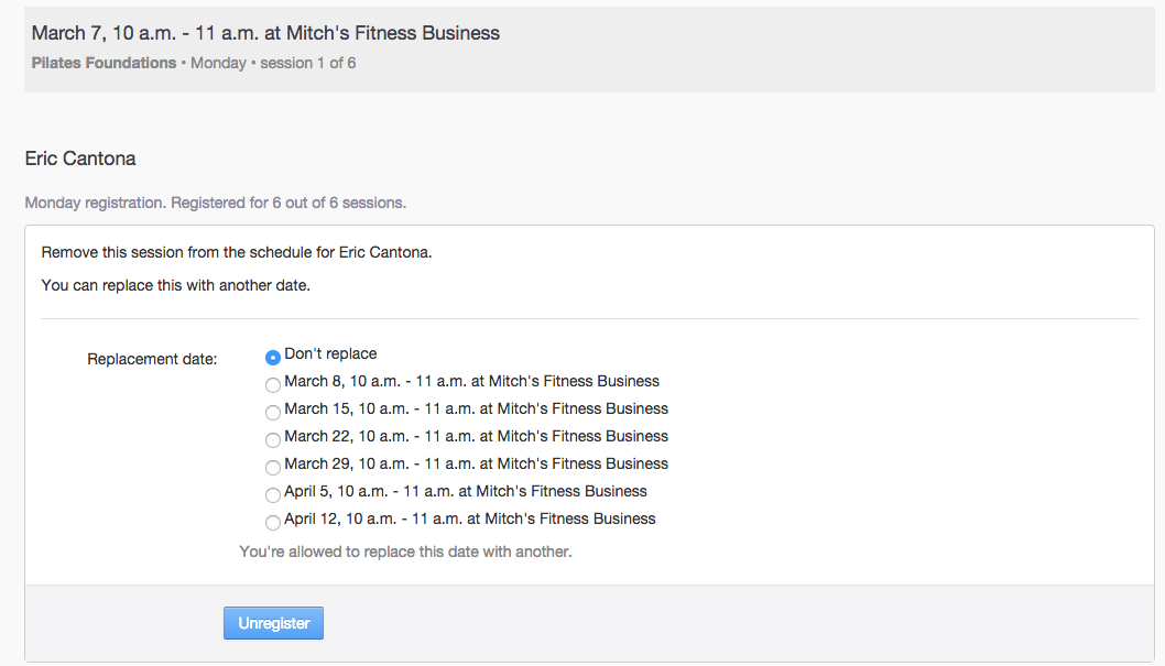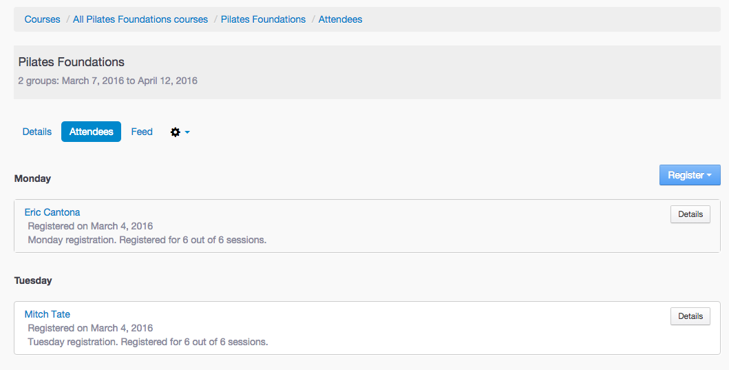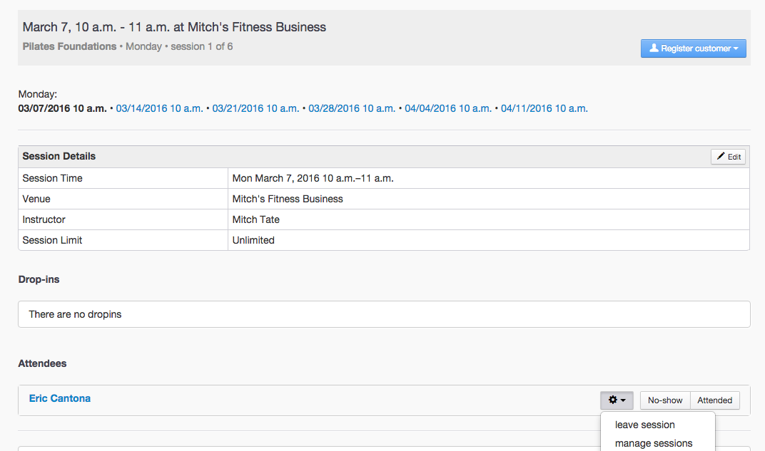 You'll be able to mark customers as attended or no show. You'll also have the option to remove a customer from a session or to manage all their sessions.