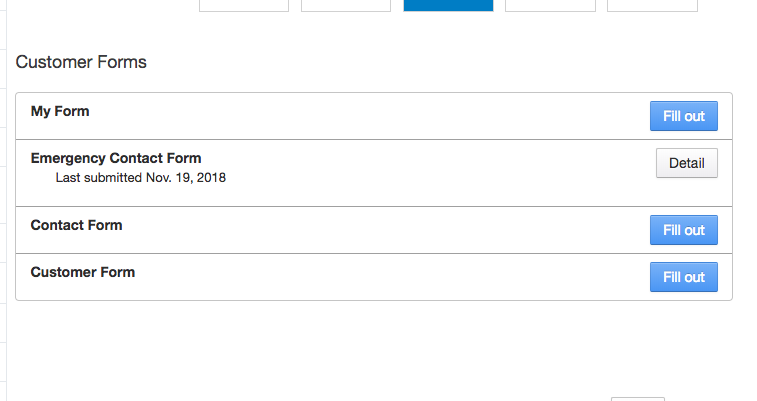 If the customer has ever submitted the form, there will be a 'Detail' button next to the form's name and a timestamp of the last submission below the form's name.