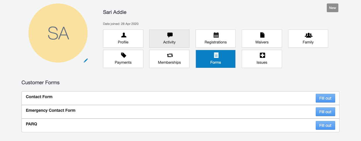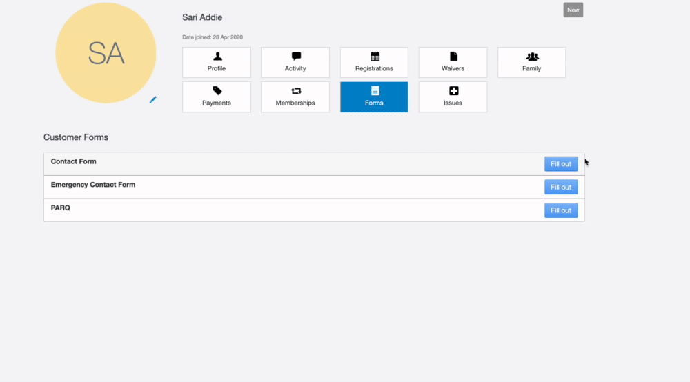 To access the forms on a customer's profile, head to Customers >> Customer list >> search customer >> click on the 'Forms' tab.