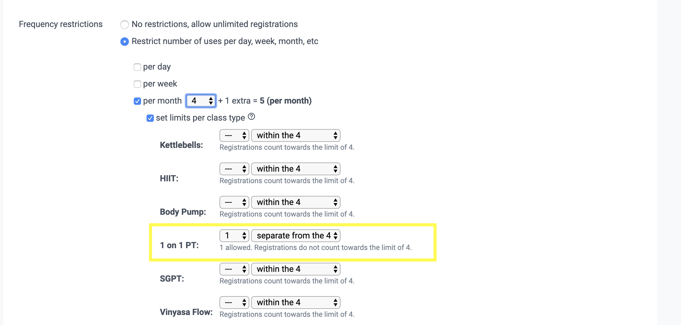 For instance, the below allows regular 4 classes per month + 1 PT session.