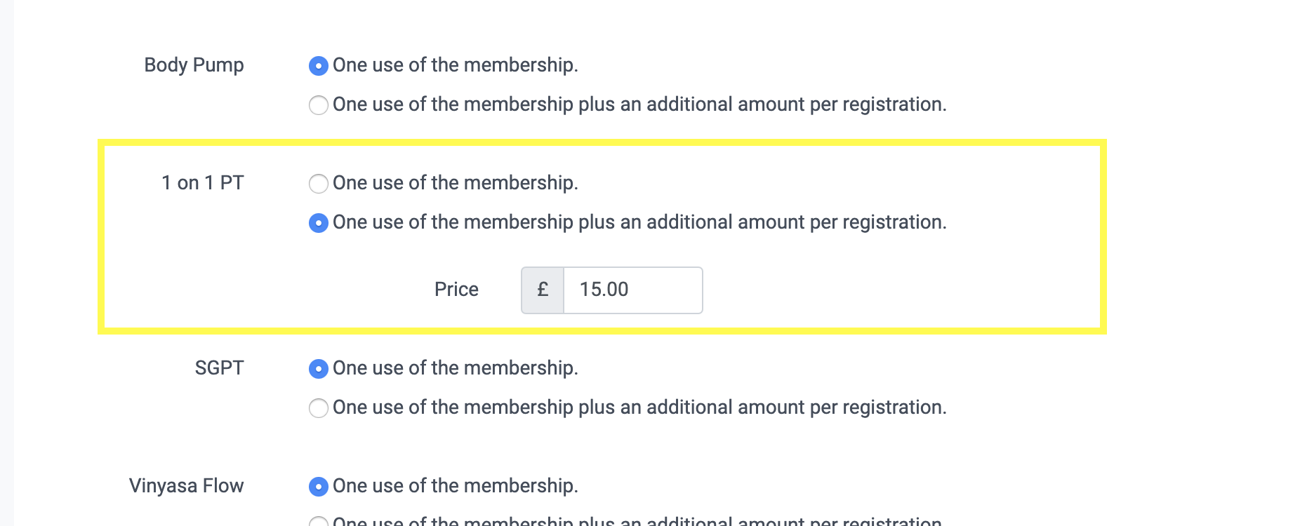 From here you can set pricing to be "One use of the membership plus an additional amount per registration". In the below example it's £15 per 1 on 1 PT session.