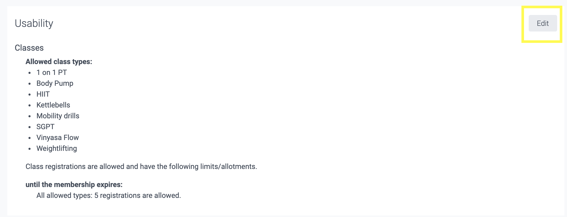 To change an existing membership, head to Memberships >> click desired membership >> click Edit besides Usability.