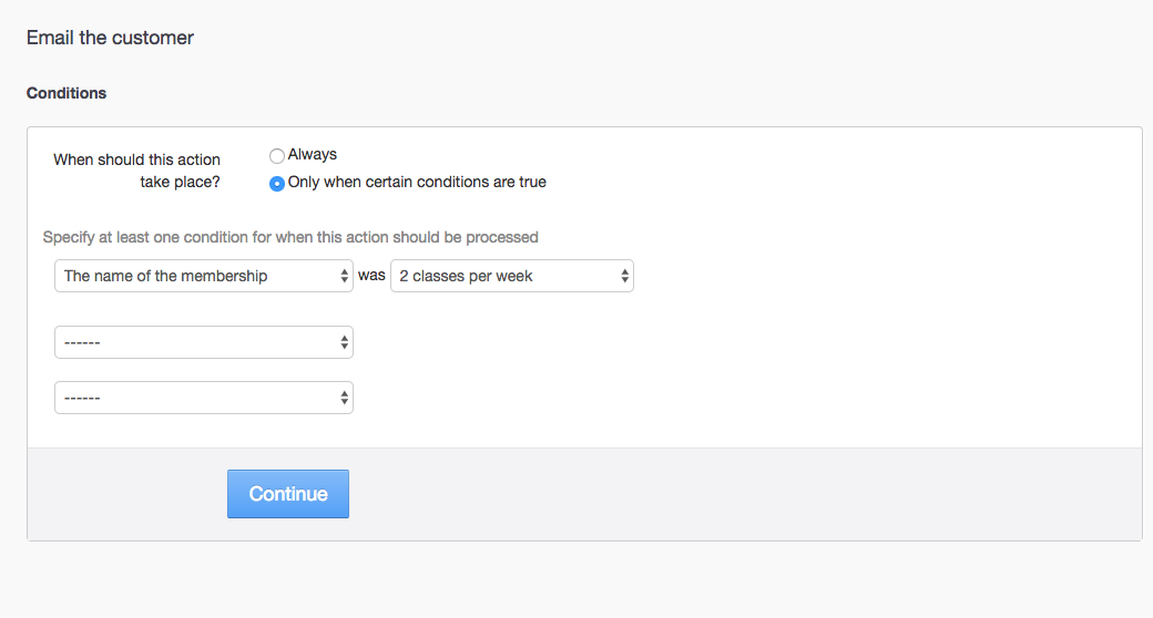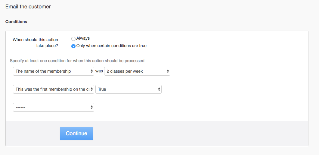 You can also choose multiple conditions if desired. In the below example the customer would be emailed if they were buying the '2 classes per week' membership, and it was the first time they had owned it.