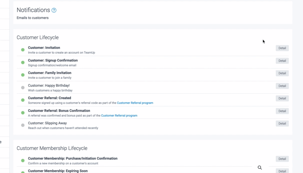 To get started, navigate to your notifications section, and scroll down to Customer Membership Lifecycle >> Customer Membership: Purchase/Initiation Confirmation >> click 'Detail'.