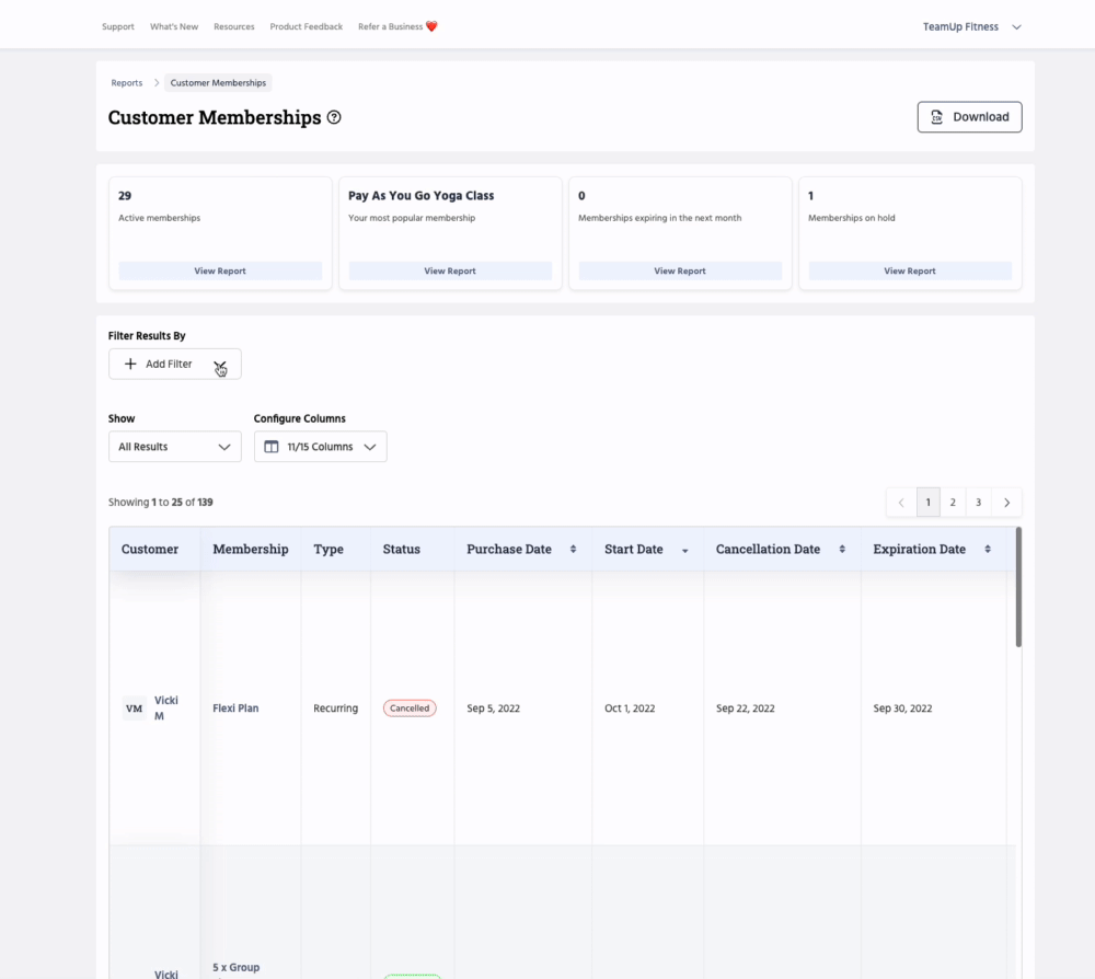 - Head to Reports. Here, click the 'All Customer Memberships' report.