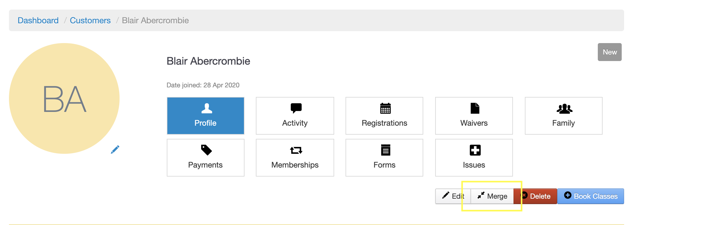 🚨 Important - please read before merging! If you start the merge from the oldest customer profile, this will save all their completed Forms and Waivers onto their merged profile. On the other hand, if you begin the merge from the newest profile, this information will be lost, and customers will need to resubmit.