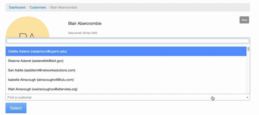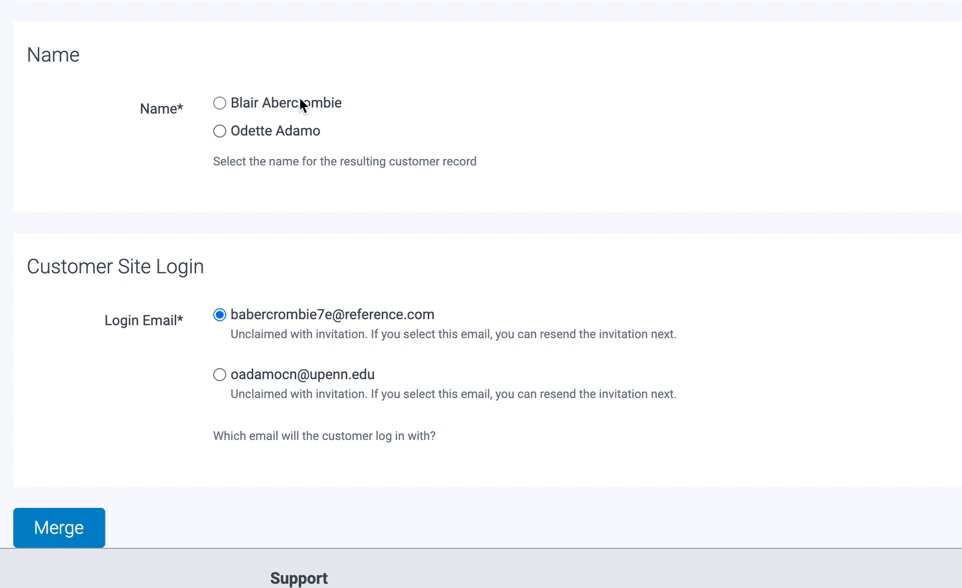 4. Now, select the customer name and the email you'd like to keep and click 'Merge'.