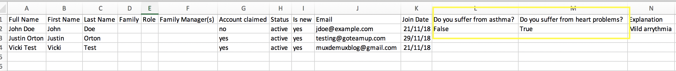 2. If you chose to collect the answers as yes or no questions, the CSV report would show: