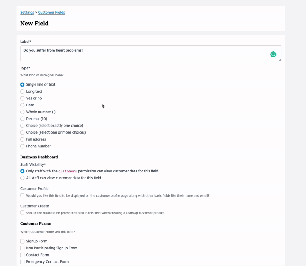 There are different ways to handle these types of questions within TeamUp, depending on how you wish to store the data. Using the example above, let's explore a few of the options.
