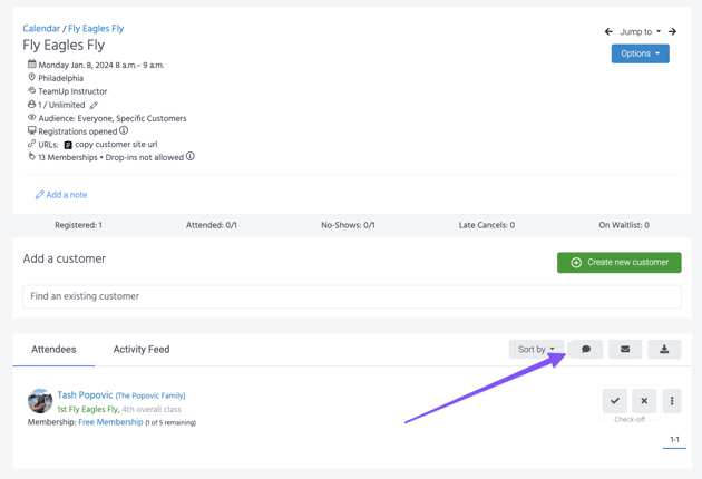 Once customers have registered for their classes, you'll notice a new speech bubble icon on your class detail page.