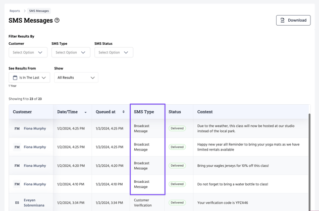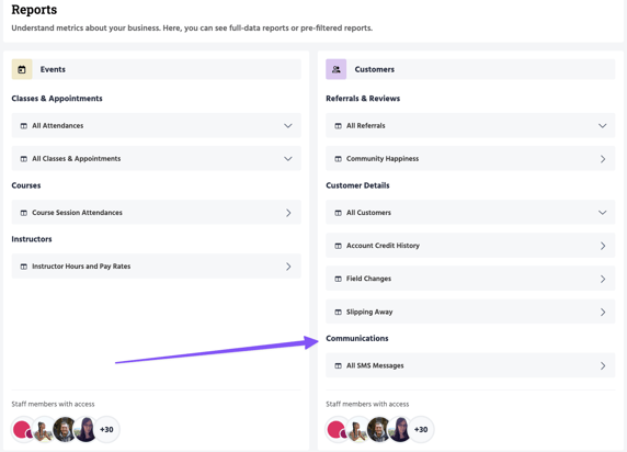 This report lists all SMS sent to customers during any given timeframe. To view it, head to Reports >> Communications >> All SMS Messages.