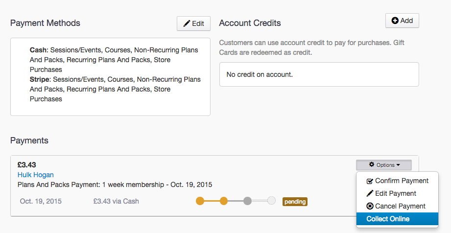 You can also process a pending offline payment as an online bill, from the customer's profile, in the payment tab, or from their membership detail page.
