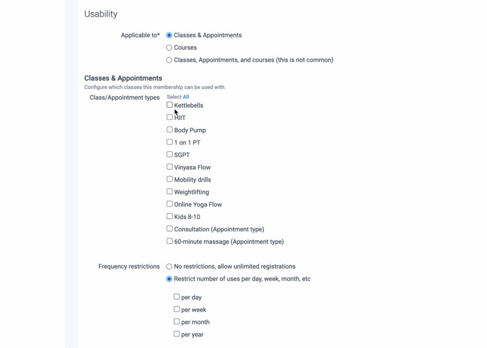 Usability allows you to set how many classes and/or courses are available for a particular membership, and over what time frame they can be used.