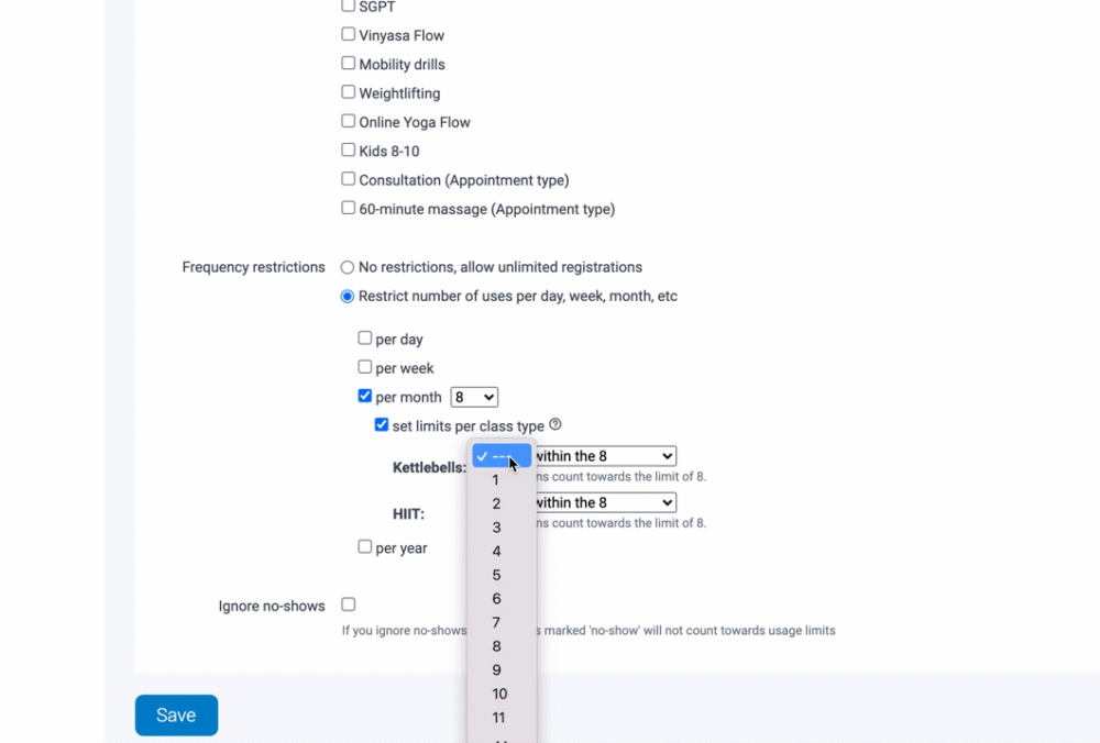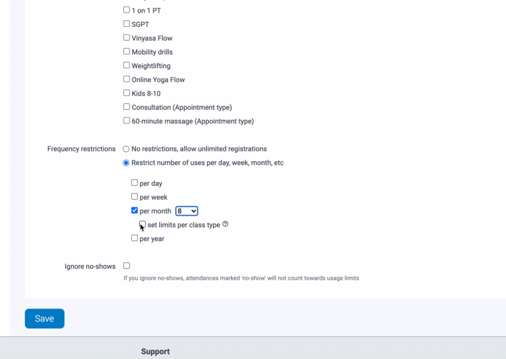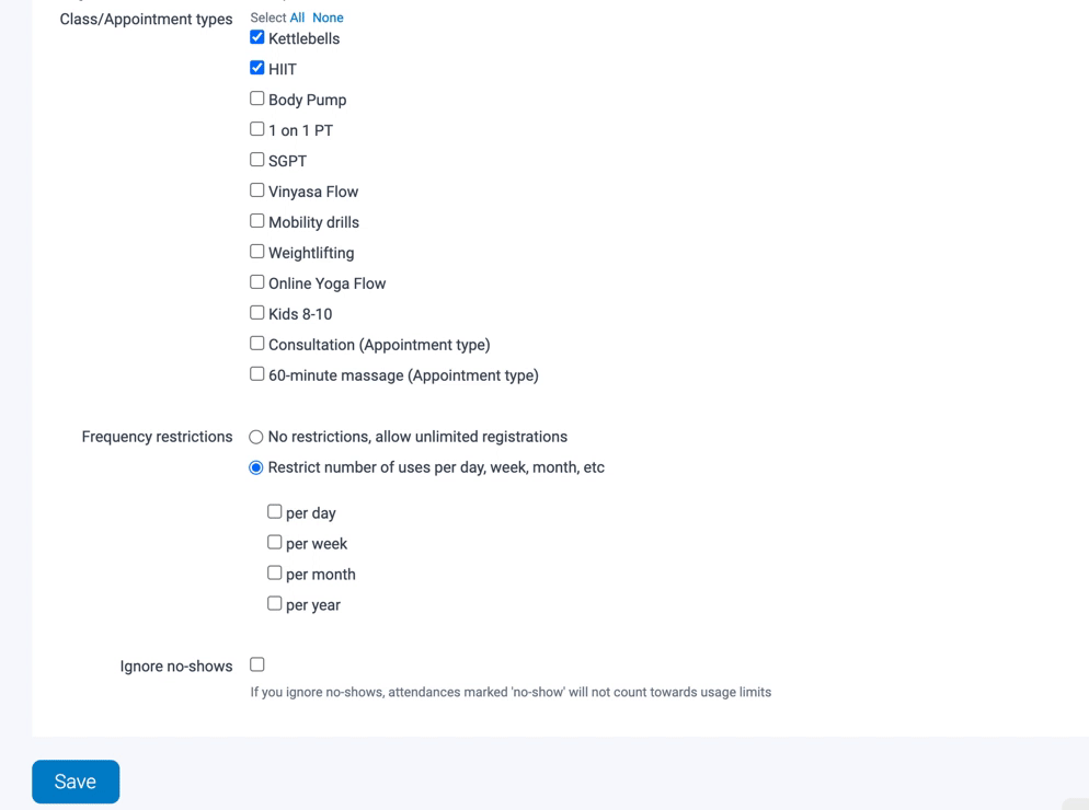 When choosing no restrictions under Frequency Settings, this will mean any customer who owns this membership will get unlimited classes within the billing period and the Class/Appointment Type/s allowed.
