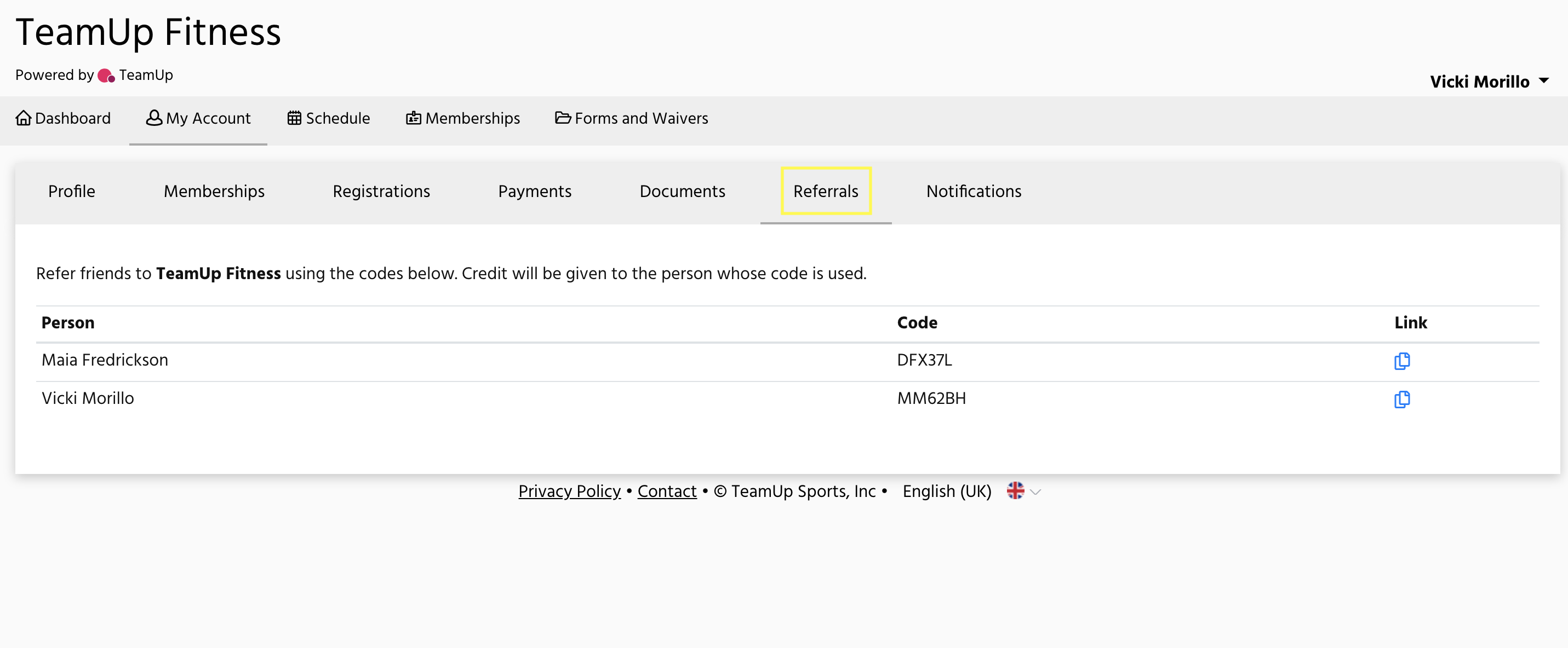 The customer-side Referrals tab under My Account lists codes for participating customers.