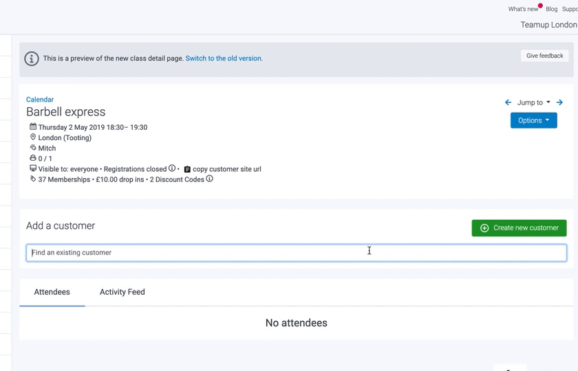 On the class detail page, under 'Add Customer,' search and select the customer you wish to add to the class or click 'Create a new customer' if they don't have a TeamUp account yet.