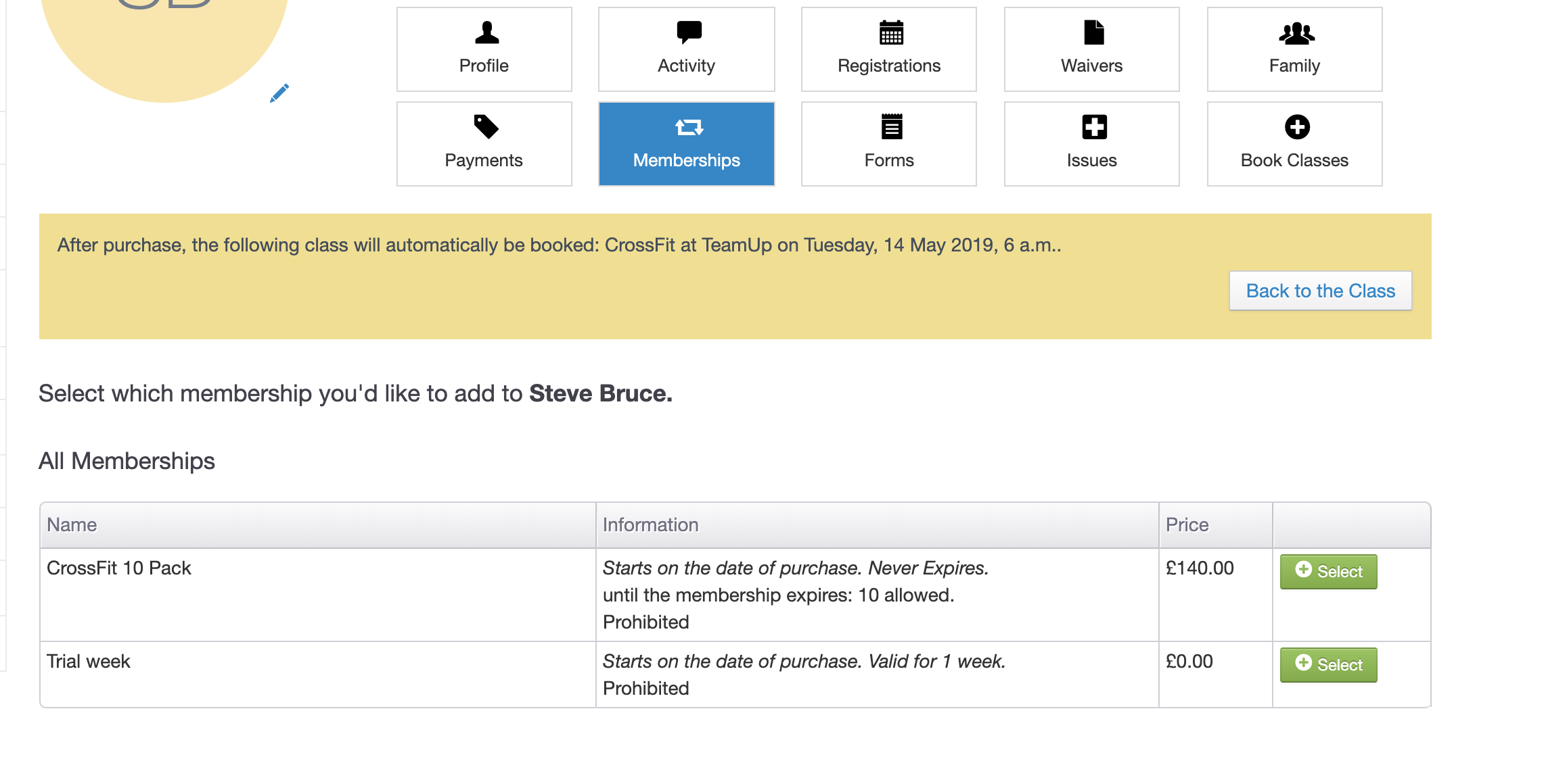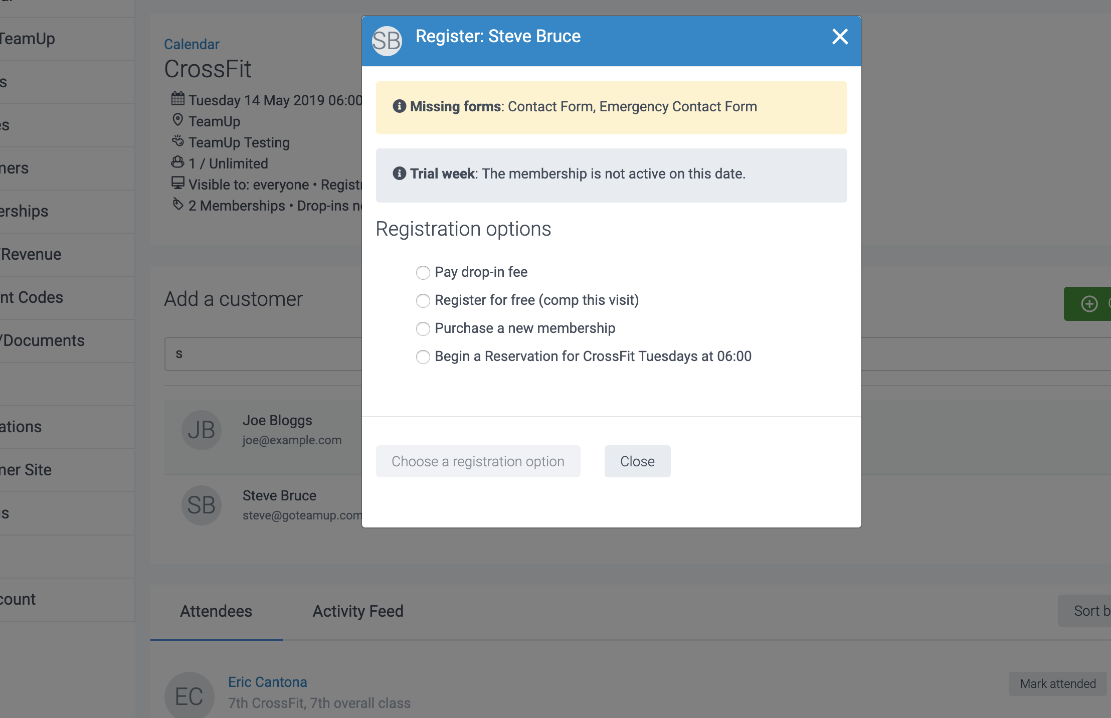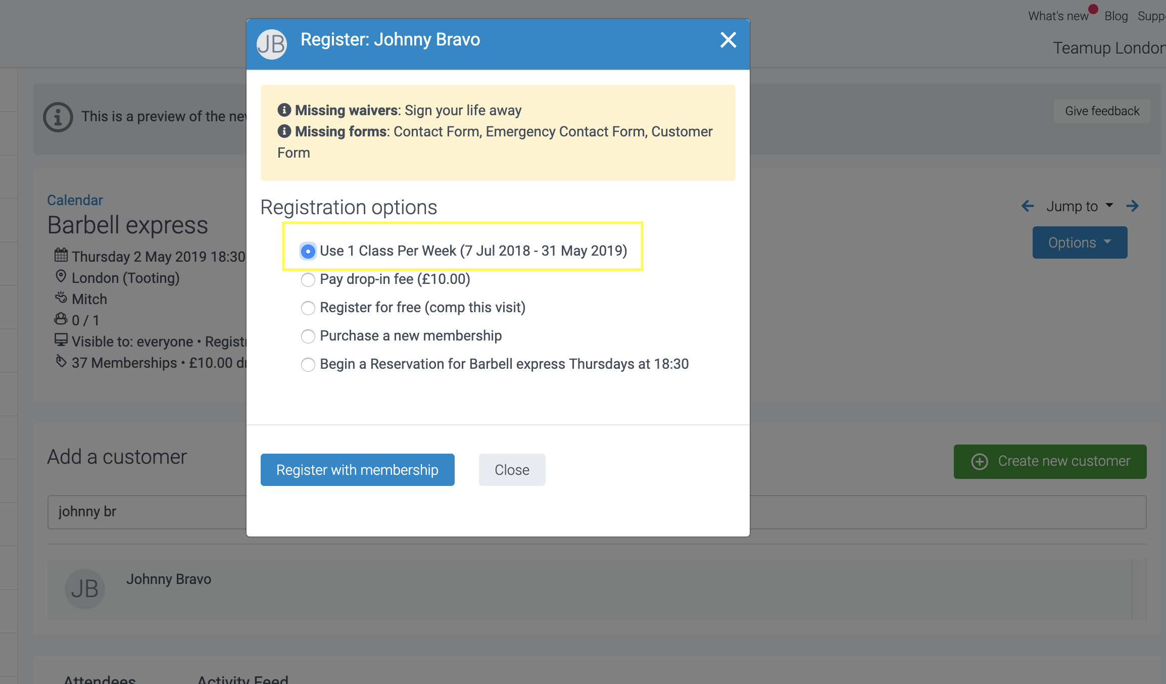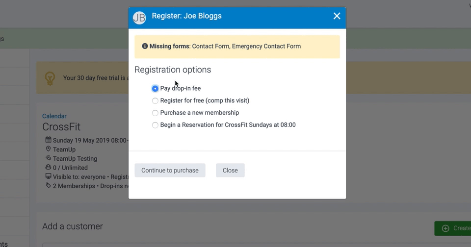 Purchase a new membership. Select this option if the customer needs to hold a valid membership to register. You'll be asked to select the membership in the next step. Once added, the customer will be booked into the class automatically.