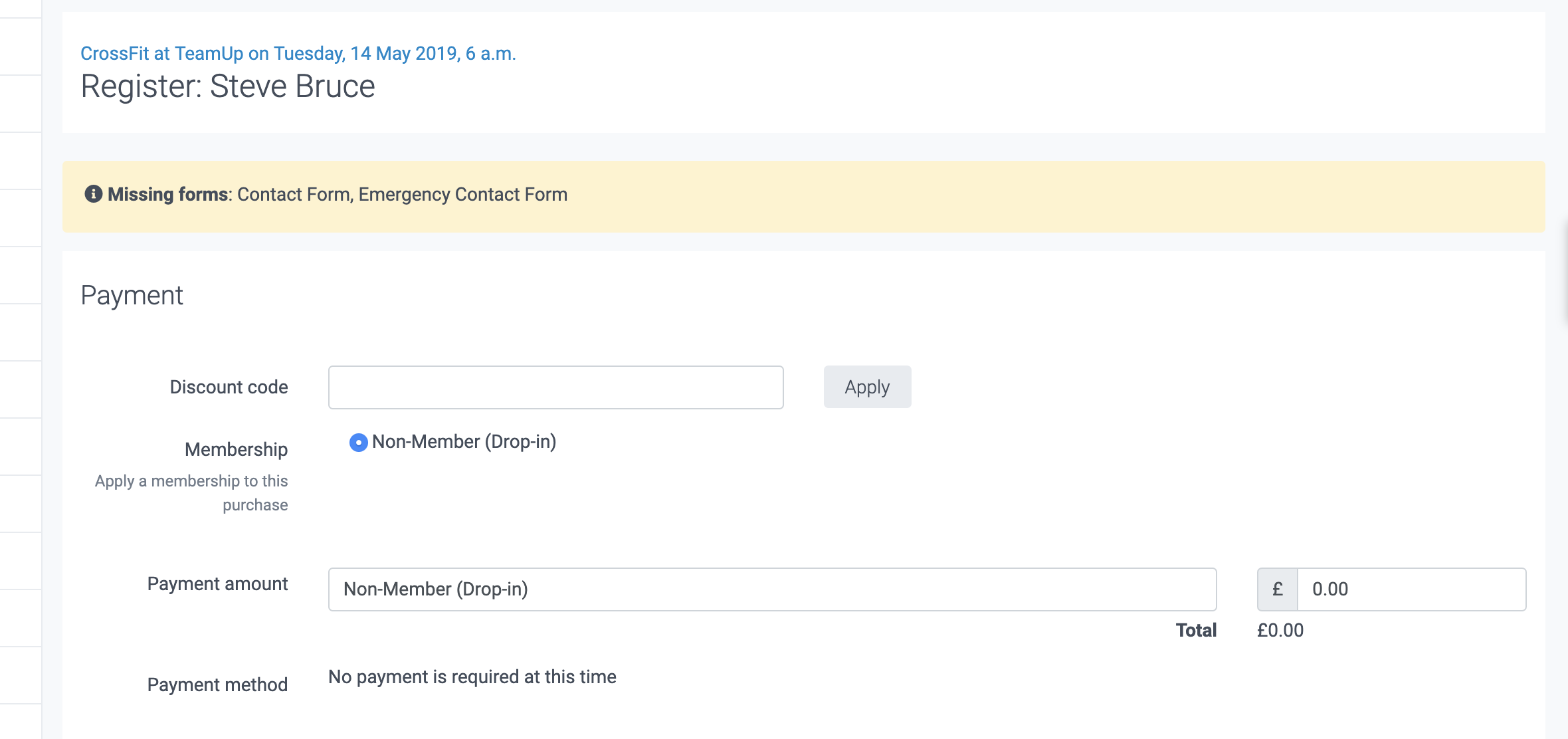 Pay drop-in fee. If the customer needs to pay a drop-in fee, click this option. You will be redirected to a complete registration page where you will have the option to specify a drop in fee and enter a discount code if applicable.