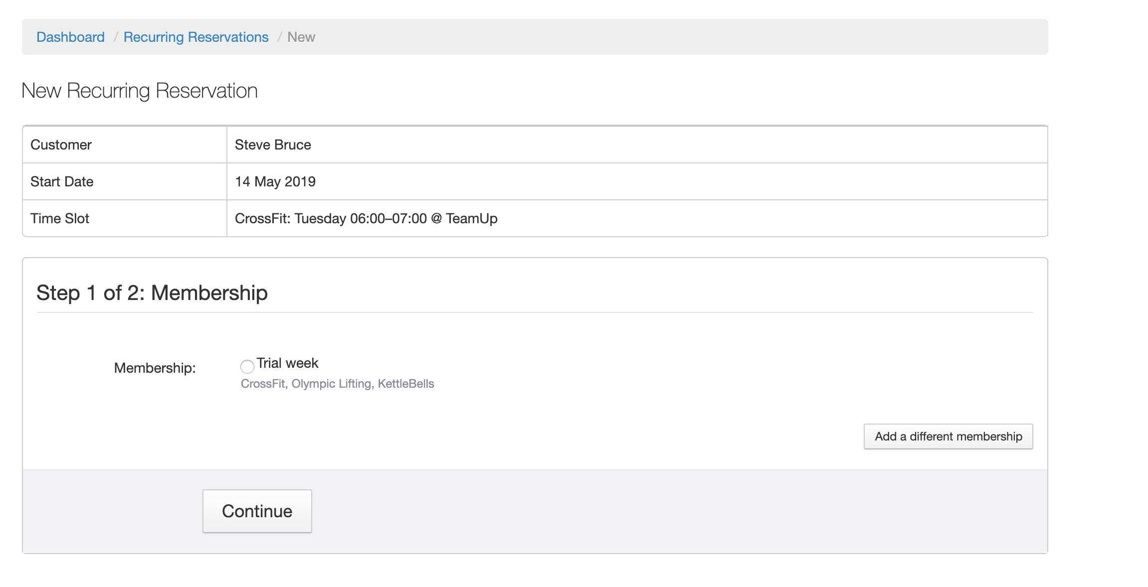 Begin a recurring reservation. You can also choose to book the customer in for this session, and all upcoming ones in this time slot, via a recurring reservation. In the next step, you'll be asked to create the reservation. If the customer doesn't yet have a membership, the system will also prompt you to add one for them.