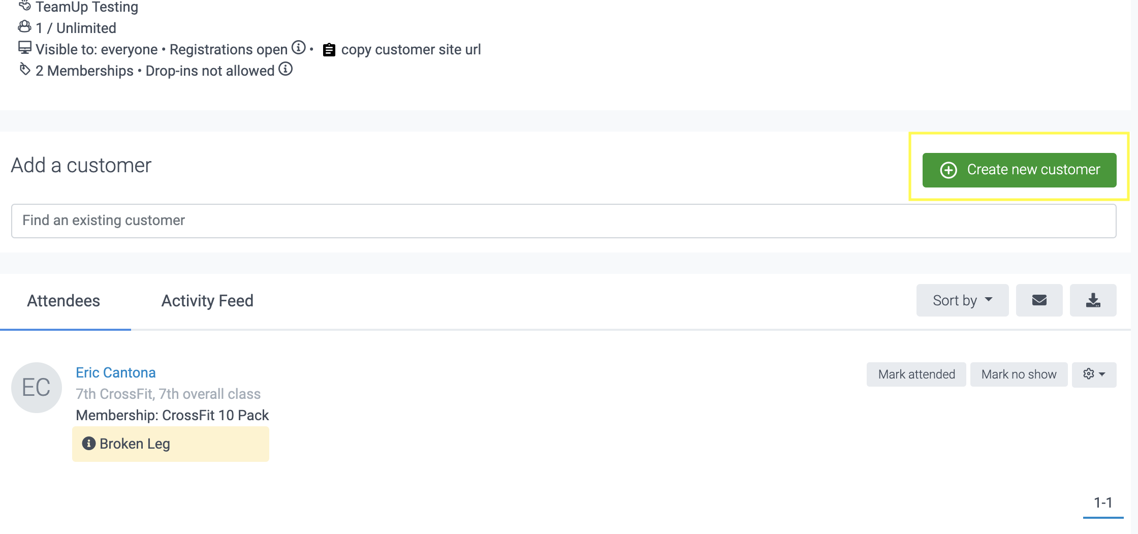 To register a customer who doesn't yet have a TeamUp account, click the 'Create a new customer' button.