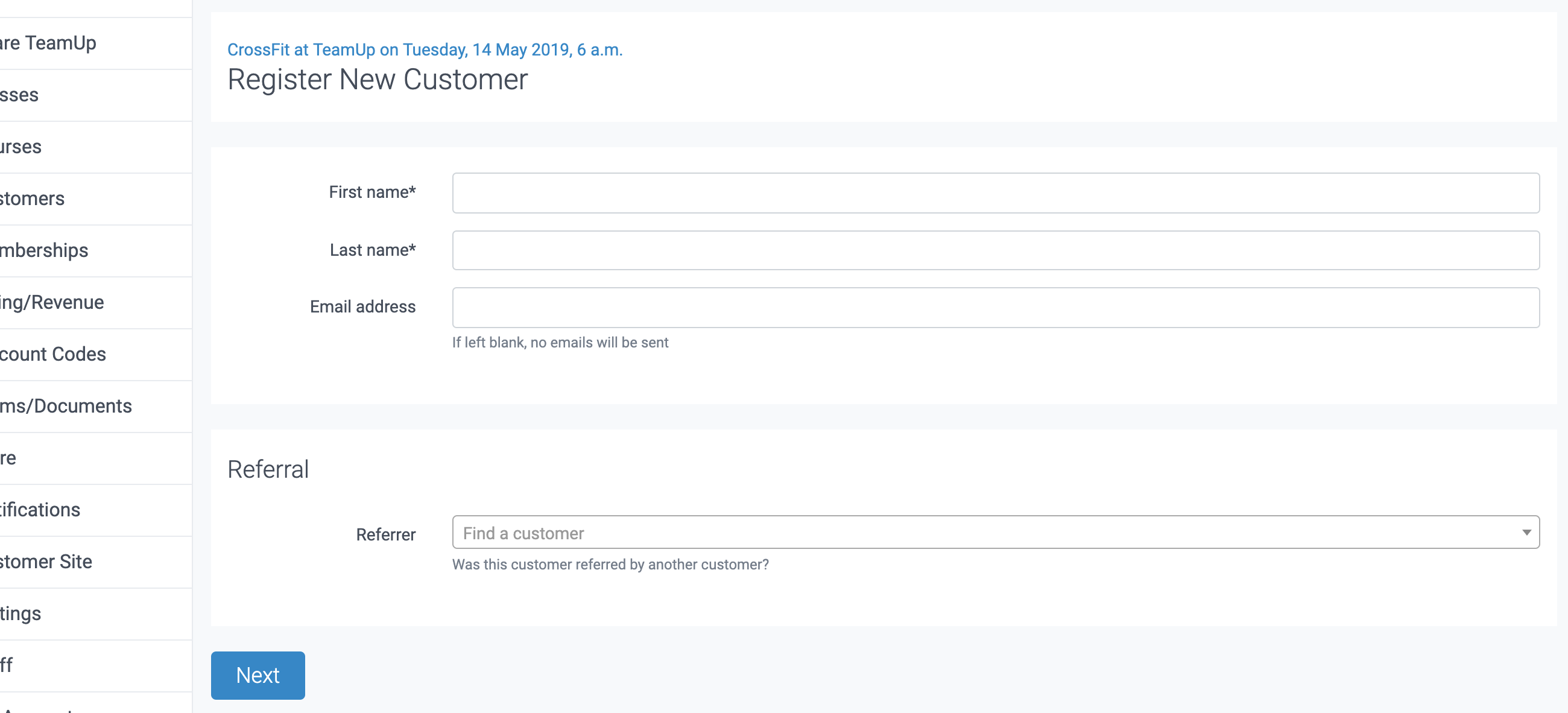 You will be prompted to enter the customer's details and a referral code if applicable. Once done, they will be added to the class instantly.