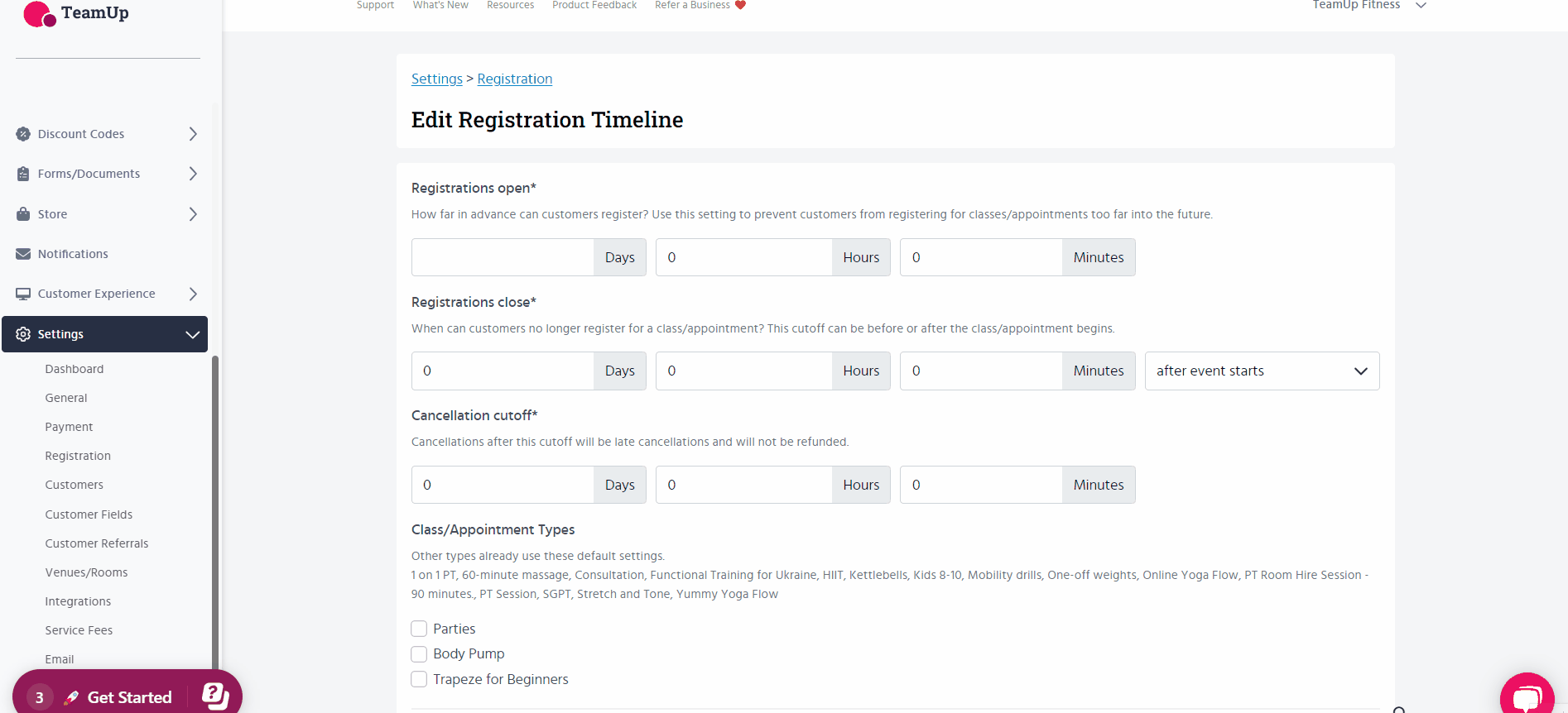 Registration settings - Set when customers can no longer register for a class