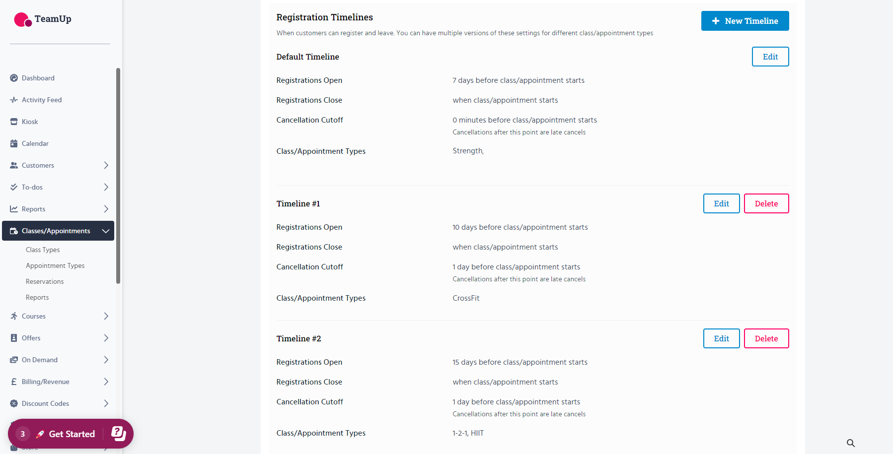Note: Since timelines also include the cancellation cutoff and registrations close settings, you would need to either edit an existing timeline and add the class type to it, or create a new timeline if you need an all-new settings combo.