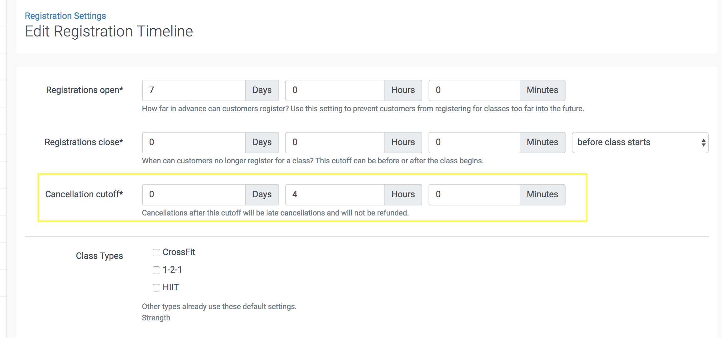 Registration settings - setting a cancellation cutoff time for classes