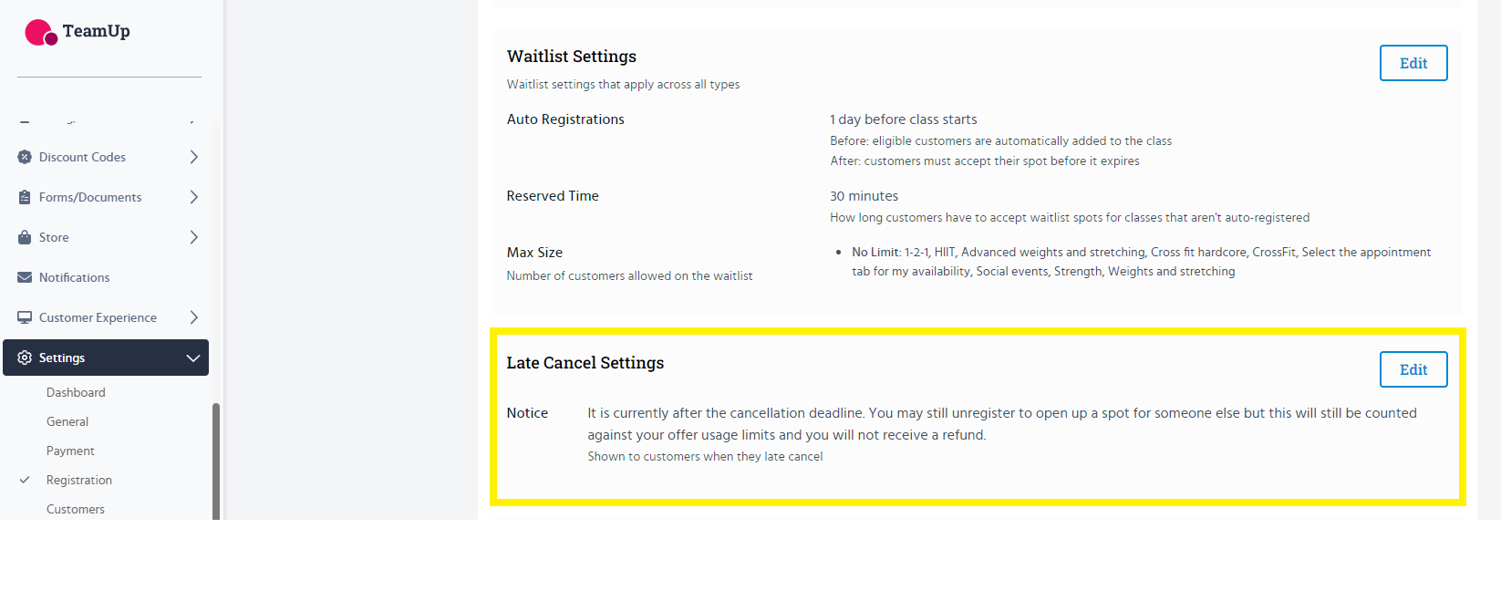 You can use the late cancel notification on TeamUp to email customers who late cancelled from a class, and remind them of your cancellation policy, or you might want to send them a pre-class reminder to help prevent late cancelations. For more information on how to set these notifications up, please see: