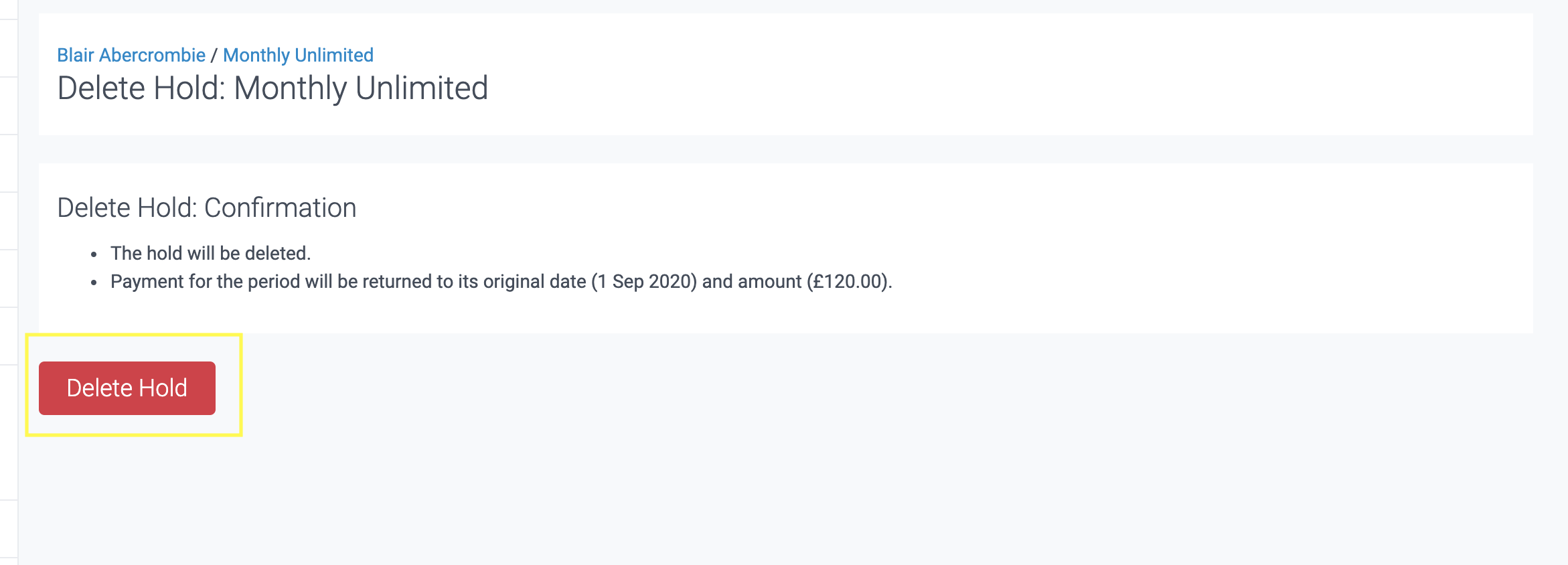On the next page, you'll be asked to confirm the deletion. Please note that if you delete the hold, no prorates are calculated on payments or class usage allowance for partial months.