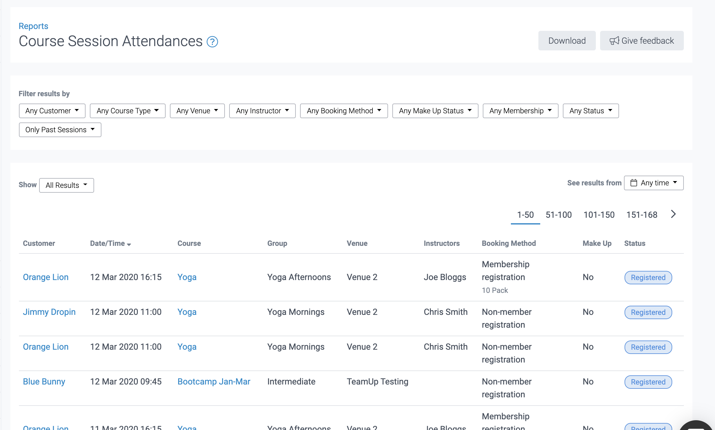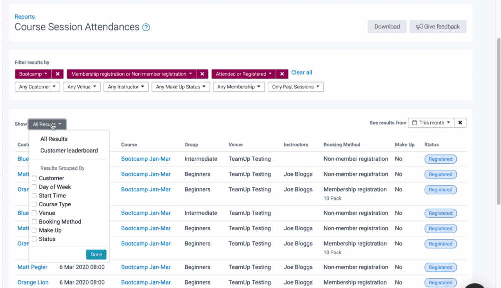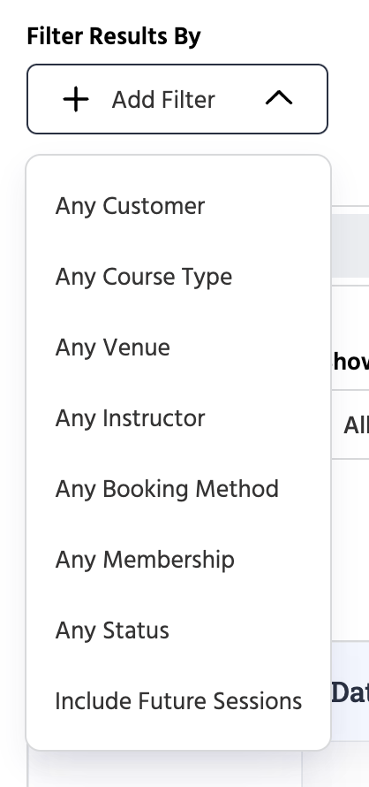 Booking method. This filter allows you to view how the customer booked the course: membership registrations (registered using a membership credit), non-member registrations (paid the non-member price) and single-session registrations (purchased a drop-in).