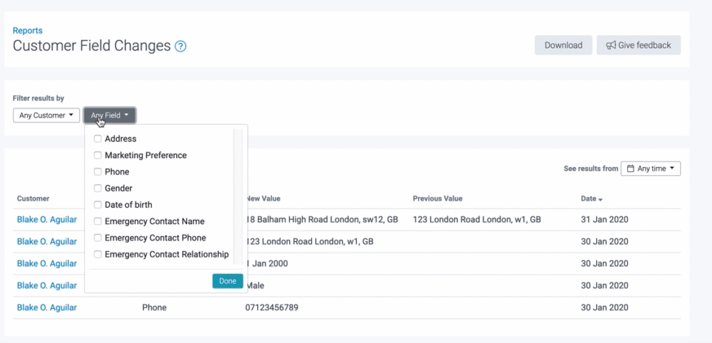 View a history of changes to customer fields, such as emergency contact details, phone number, or marketing preference in this handy report*.