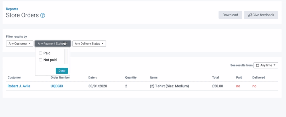 Filter by product, payment status, delivery status and desired date range, and group results by year, month or product quantity.
