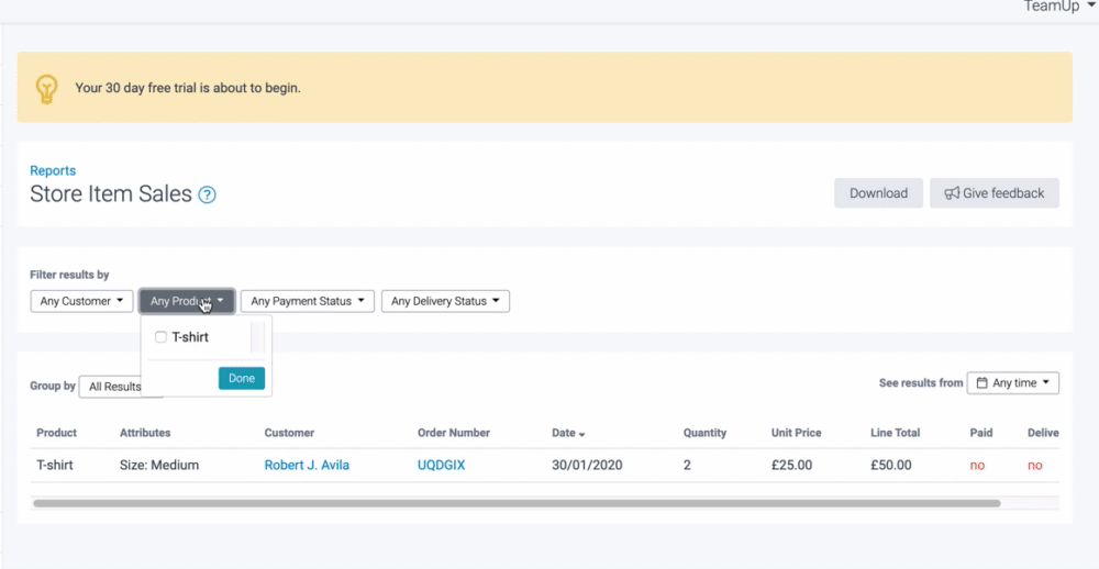 This report allows you to view and download your TeamUp store's order history and sales reports.