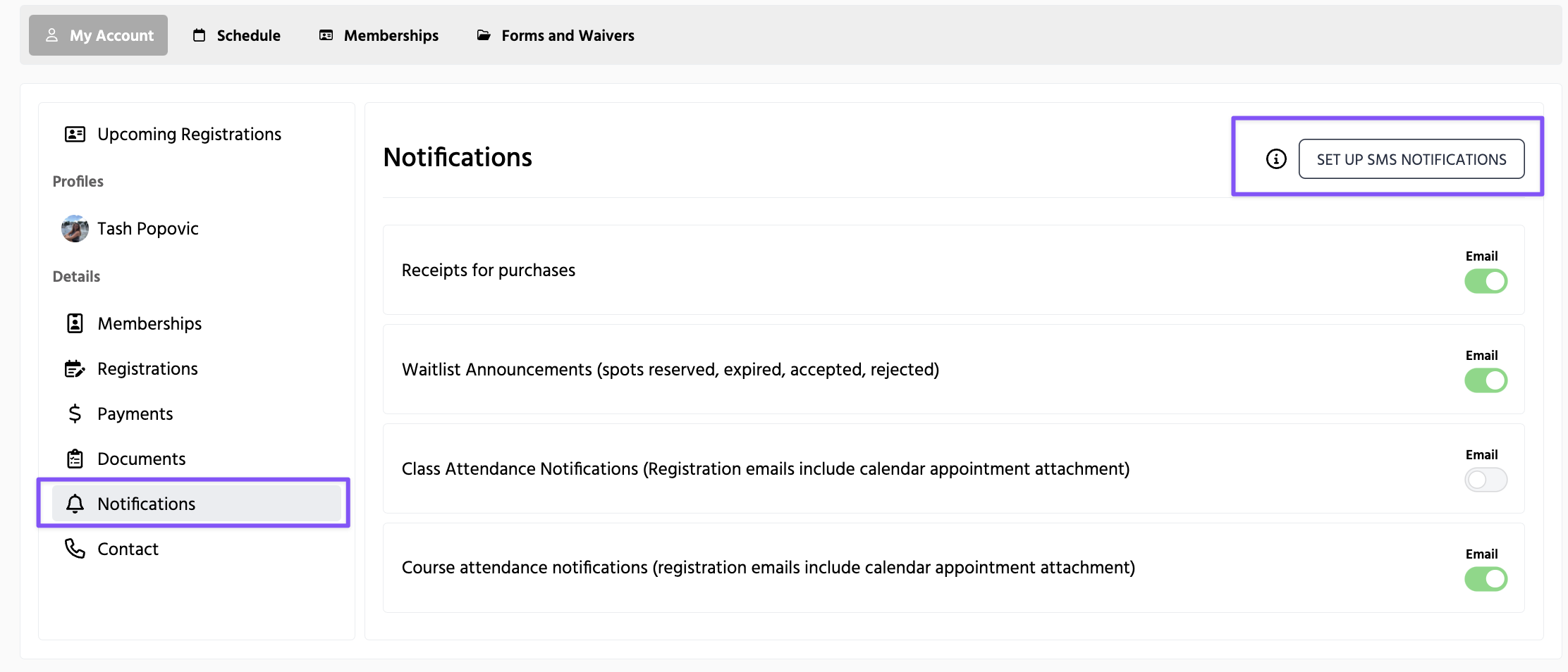 Once enabled, you'll receive text messages from your gym or studio about waitlist updates, or class and appointment reminders, or changes to classes and appointments you're registered for (date/time changes, cancelations, etc.) or a combination of the above.
