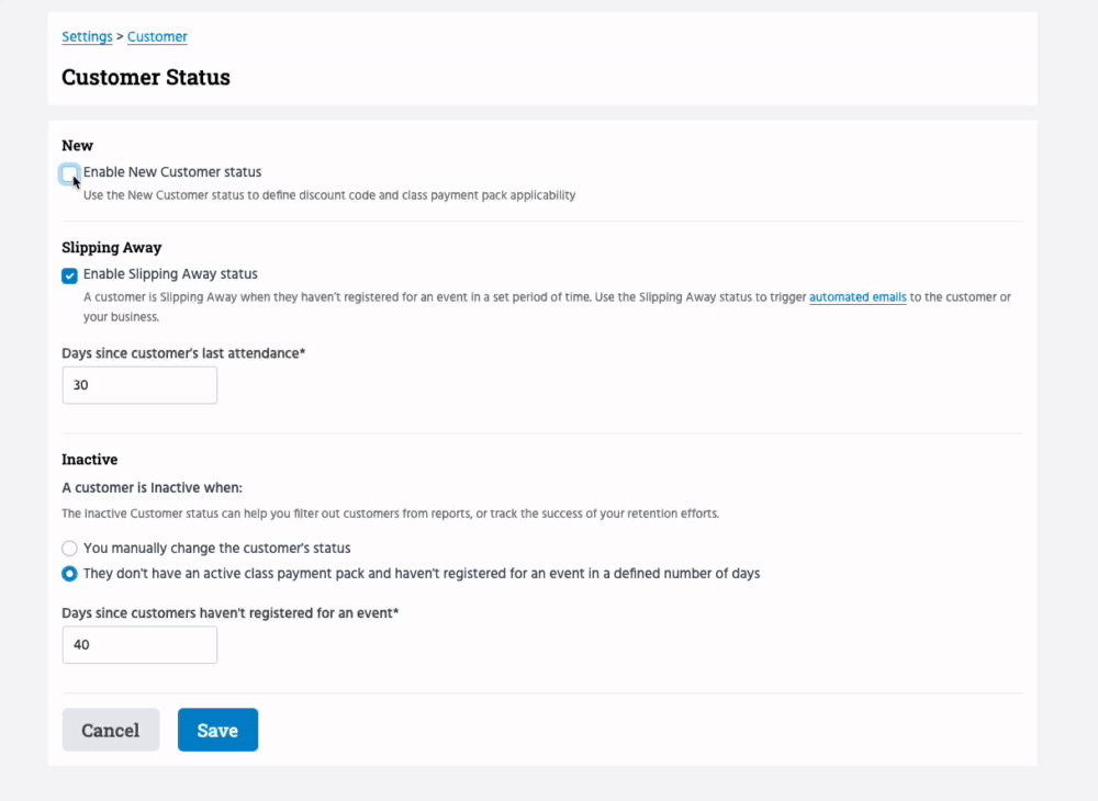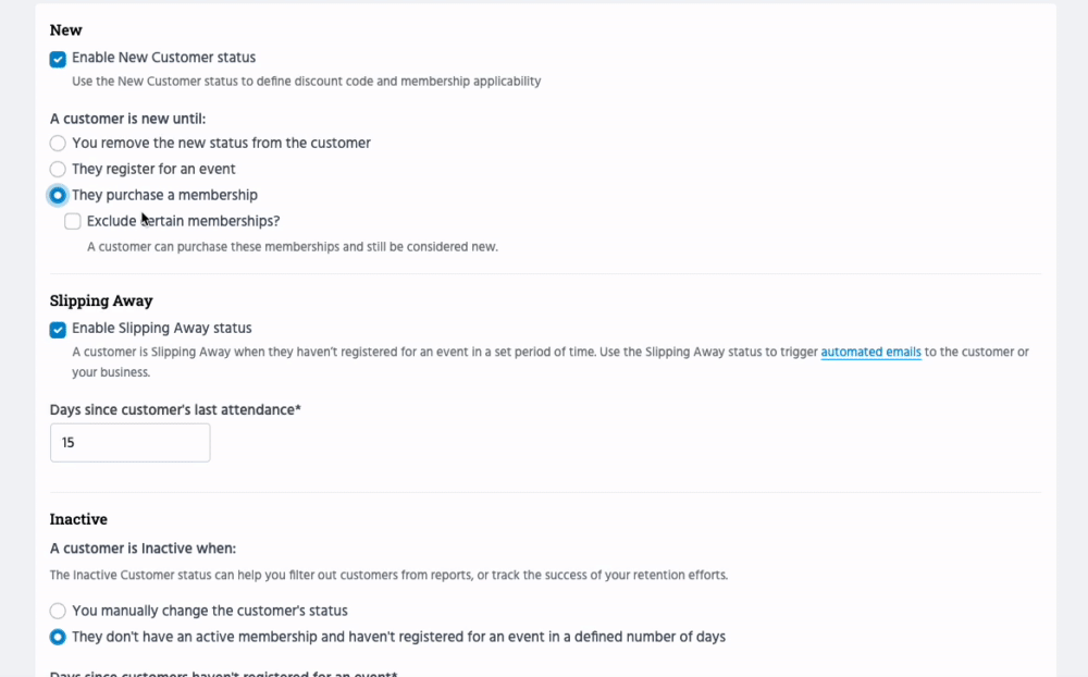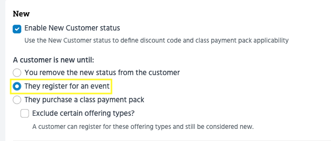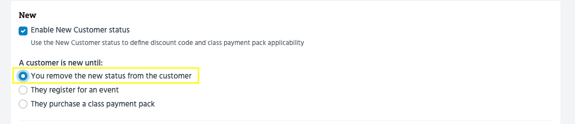 This setting gives you the option to define when a customer is "New". For example, a customer is "New" until they purchase a membership. Maybe you want to give some extra attention to your new customers, manage new customer sales opportunities more closely, or even create discount codes that apply to new customers only.
