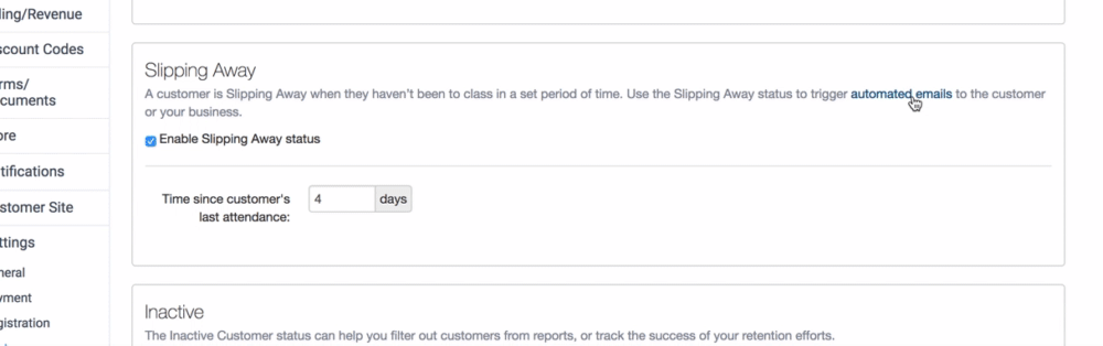 The 'slipping away' customer status can help you find customers who haven’t been attending their sessions. This status can also be used to trigger automated emails to customers or to the business.
